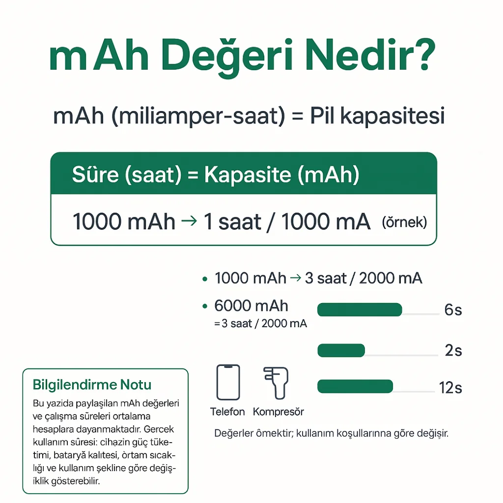 Not: Bu yazıda paylaşılan mAh değerleri ve çalışma süreleri ortalama hesaplara dayanmaktadır. Gerçek kullanım süresi; cihazın güç tüketimi, batarya kalitesi, ortam sıcaklığı ve kullanım şekline göre değişiklik gösterebilir.